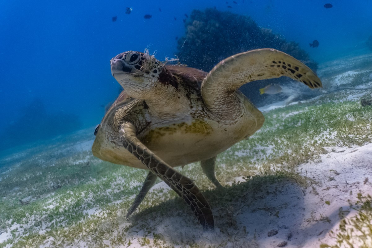 The green sea turtles are one of the world’s largest species of turtle. The largest ever recorded was 5 feet long and weighed more than 800 pounds. The adult turtles are gentle herbivores that can live up to 80 years old. They are important to the marine ecosystem as they help maintain healthy seagrass beds and coral reefs.