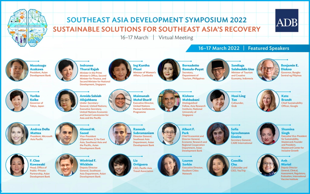 Other speakers include Ing Kantha Phavi, Minister of Women’s Affairs, Cambodia; Sandiaga Salahuddin Uno, Minister of Tourism and Creative Economy, Indonesia; Benjamin Diokno, Governor, Bangko Sentral ng Pilipinas; Armida Salsiah Alisjahbana, Under-Secretary-General, United Nations and Executive Secretary, United Nations Economic and Social Commission for Asia and the Pacific; Kishore Mahbubani, Distinguished Fellow, Asia Research Institute, National University of Singapore; Ahmed M. Saeed, Vice-President for East Asia, Southeast Asia, and the Pacific, ADB; Ramesh Subramaniam, Director General, Southeast Asia Department, ADB; Albert F. Park, Chief Economist and Director General, Economic Research and Regional Cooperation Department, ADB; Sofia Sprechmann Sineiro, Secretary General, CARE International; Shamina Singh, Executive Vice-President for Sustainability, Mastercard and Founder and President, Mastercard Center for Inclusive Growth; F. Cleo Kawawaki, Head of the Office of Public–Private Partnership, ADB; Winfried F. Wicklein, Deputy Director General, Southeast Asia Department, ADB; Liz Ortiguera, CEO, Pacific Asia Travel Association; Lauren Sorkin, Executive Director, Resilient Cities Network; Caecilia Chu, Cofounder and CEO, YouTrip; Anh Wartel, Deputy Director General, Clinical, Assessment, Regulatory, Evaluation, International Vaccine Institut; and Sungsup Ra, Chief Sector Officer, Sustainable Development and Climate Change Department, ADB.