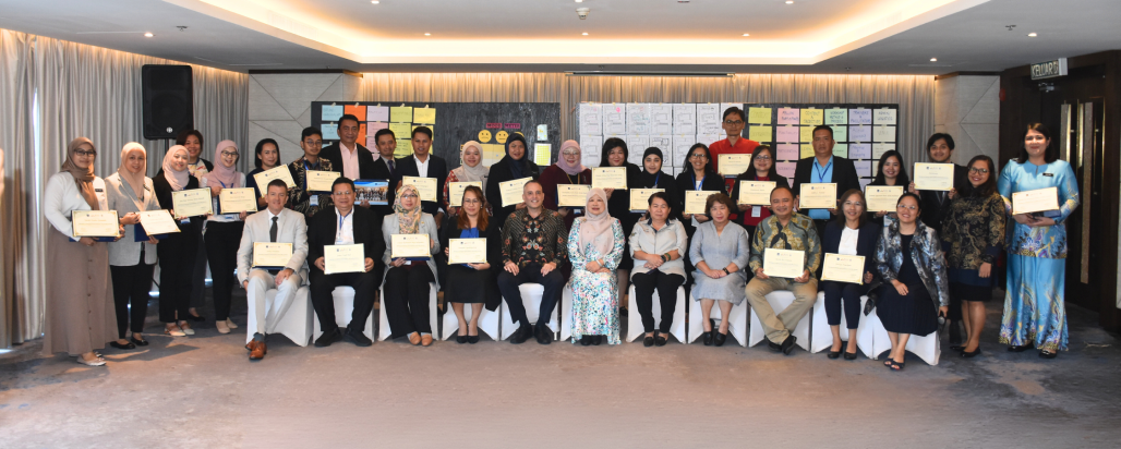 BIMP-EAGA and IMT-GT government officials and training team with (5th-7th from left) Alfredo Perdiguero, Regional Head, Regional Cooperation and Integration, Southeast Asia Department, ADB; Diyanah Abdullah, Deputy State Secretary and Chairperson of Sabah BIMP-EAGA Secretariat; and Mary Malangking, Deputy Permanent Secretary I, Ministry of Tourism, Culture and Environment Sabah at the closing ceremonies of the Fostering Coastal Resilience and the Blue Economy workshop in Kota Kinabalu, Sabah, Malaysia. Photo credit: Mohd Rizal Taman.